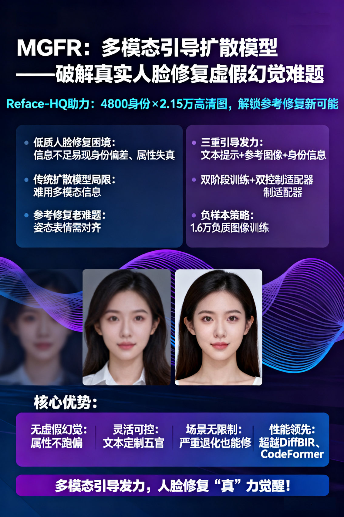 主要内容: 我们引入了一种新颖的多模态引导真实世界人脸恢复(MGFR)技术,旨在提高低质量输入的人脸图像恢复质量。MGFR 融合了属性文本提示、高质量参考图像和身份信息,可以减轻生成式人脸恢复方法中常见的错误面部属性和身份的产生。