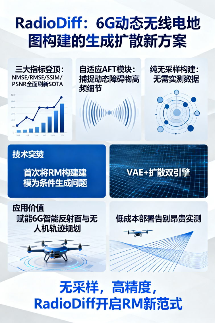 主要内容: 本文将无采样无线电地图(RM)构建建模为一个条件生成问题,提出了一种名为 RadioDiff 的基于去噪扩散的方法,以实现高质量的 RM 构建。此外,为增强扩散模型从动态环境中提取特征的能力,采用带有自适应快速傅里叶变换模块的 U-Net 作为骨干网络。实验结果表明,所提出的 RadioDiff 在准确性、结构相似性和峰值信噪比三个指标上均达到了最先进的性能。
